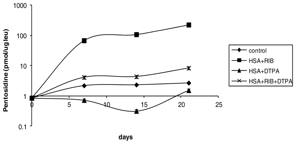 DTPA was a stronger inhibitor of ribose-dependent glycation, exhibited by pentosidine levels that reached a maximum of 8 times the level in the control sample at 21 days of incubation (Figure 2) (p < 0.001 vs. respective ribose sample at each incubation time).