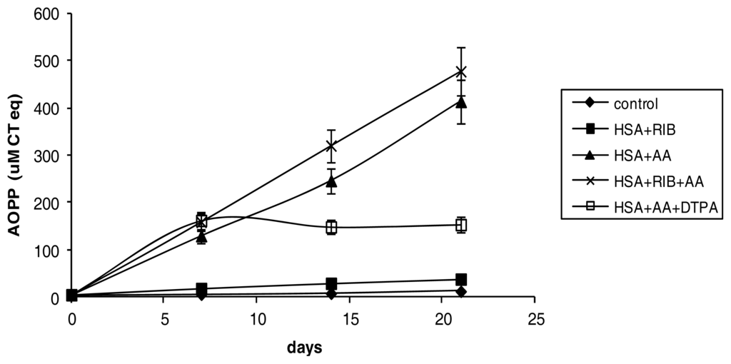 DTPA reduced the effects of AA on AOPP formation. After 7 days of incubation with DTPA, the level of AOPP was comparable to levels observed with AA incubation only. However, after day 7, the level of AOPP was relatively unchanged at approximately 27 times the level in the control sample (p < 0.001 AA vs. DTPA + AA at 14 and 21 days of incubation) (Figure 3).