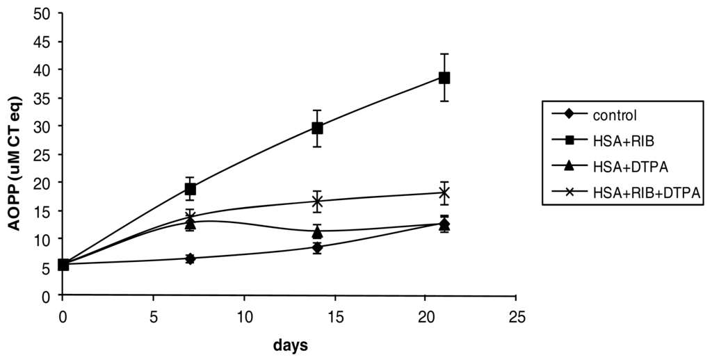 Effects of ribose, DTPA, and ribose + DTPA on AOPP formation in HSA during 21 days of incubation.