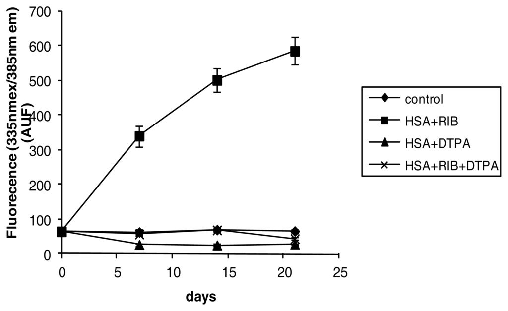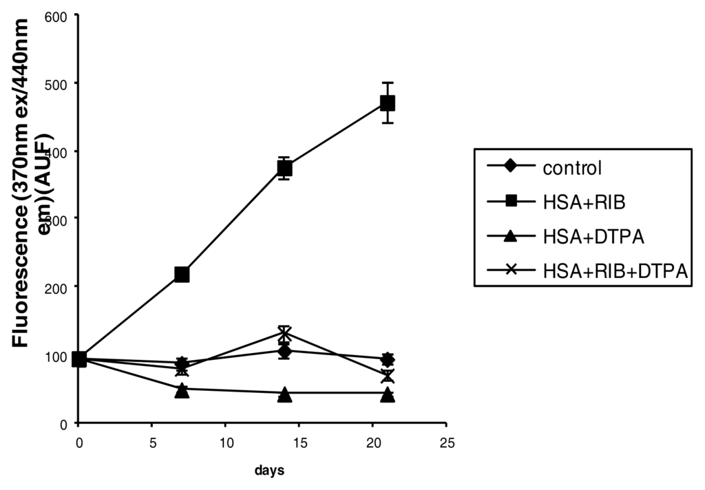DTPA abolished the ribose-induced fluorescence at 370/440 nm (ribose vs. DTPA p < 0.001 at each incubation time) (Figure 8).
