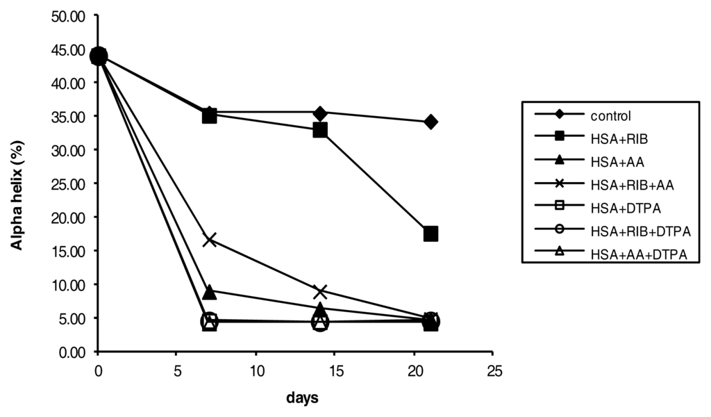The ribose + DTPA and AA + DTPA combinations and, unexpectedly, DTPA alone were the most effective modifiers of secondary protein structure. When the alpha-helix structure decreased, the beta-sheet structure also increased.