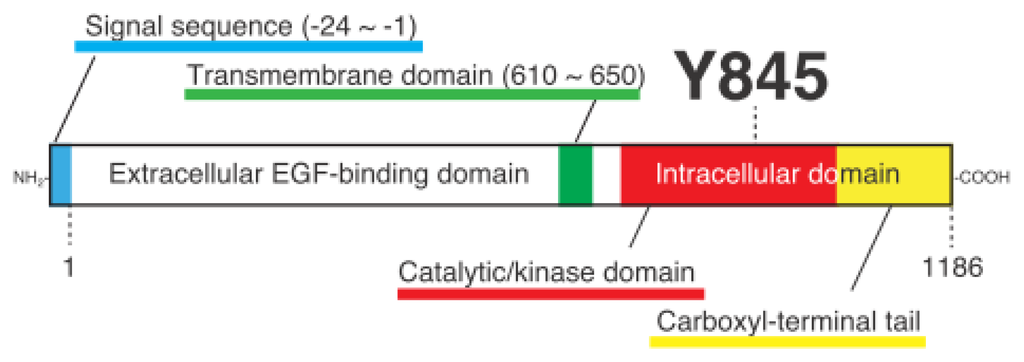 Schematic structure of EGFR. The translational protein product of the human EGFR consists of a single polypeptide of 1210 amino acids. Upon protein maturation that involves extensive glycosylation of the amino-terminal EGF-binding extracellular domain, the amino-terminal 24 amino acids are removed as a signal sequence (as indicated by a blue area), by which the mature protein becomes a polypeptide of 1186 amino acids. In addition to the extracellular domain, EGFR contains a single transmembrane domain at almost the center of the protein (green) and a carboxyl-terminal sequence that contains the catalytic/kinase domain (red) and a non-catalytic tail sequence (yellow), between the two where the Src phosphorylation site Y845 and several tyrosine residues to be autophosphorylated are located.