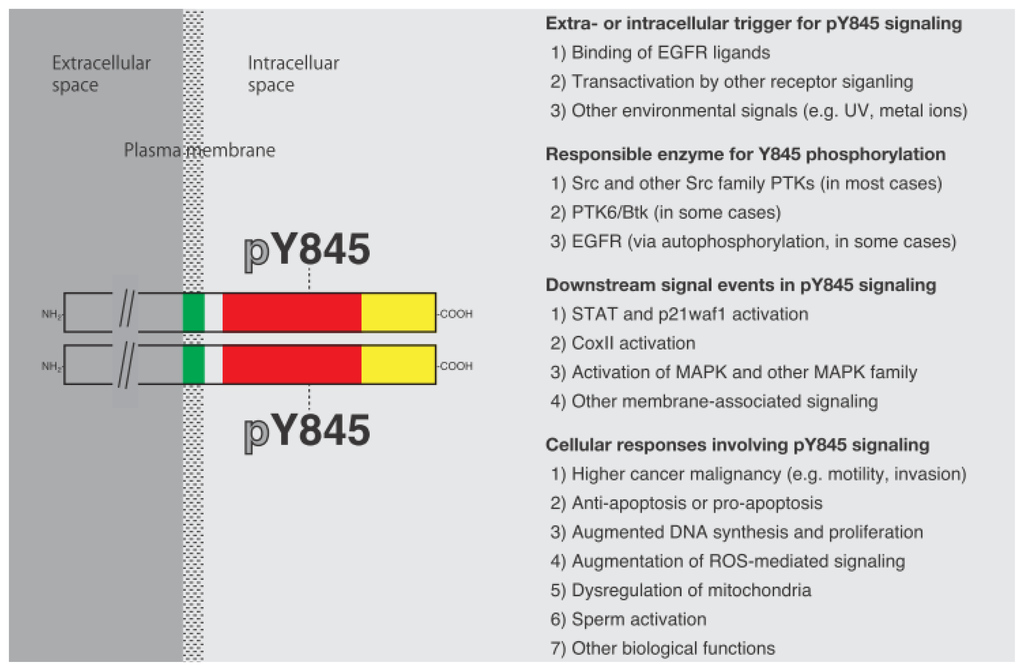 A sequence of events associated with Y845 phosphorylation of EGFR. Phosphorylation of EGFR on Y845 is usually catalyzed by Src and other Src family PTKs, and in some cases, is mediated by a non-Src family PTK or autophosphorylation of EGFR. The Y845 phosphorylation modulates a variety of cellular functions through the activation of several downstream events. It can also be used as a diagnostic marker of cancer treatments and for other applications that harness the phospho-Y845 signal into an antibody-, peptide-, or some other materials-based biological mimetics, as described in the main text.