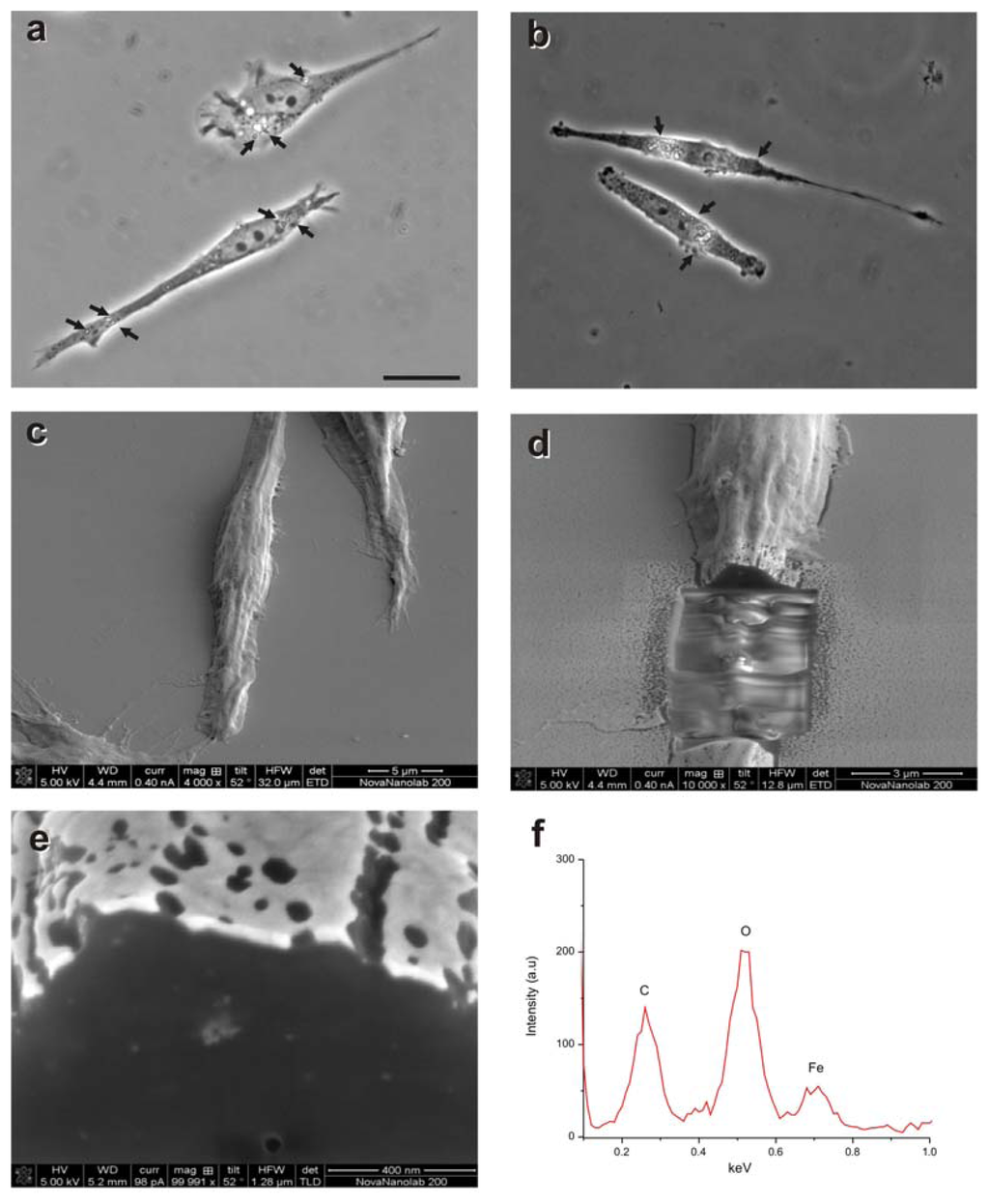 (a,b) Light microscopy photomicrographs of olfactory ensheathing cells (OECs) treated with 10 μg/mL (a) or 25 μg/mL (b) of MNPs (M-OECs) (arrows in a and b); (c,d) dual beam SEM/FIB images of M-OECs treated with 10 μg/mL of MNPs. The internalization of the MNPs can be seen in the cross section of single OEC cells (light grey spots in e) and confirmed by the Fe-content from EDS analysis of these areas (spectral analysis in f).