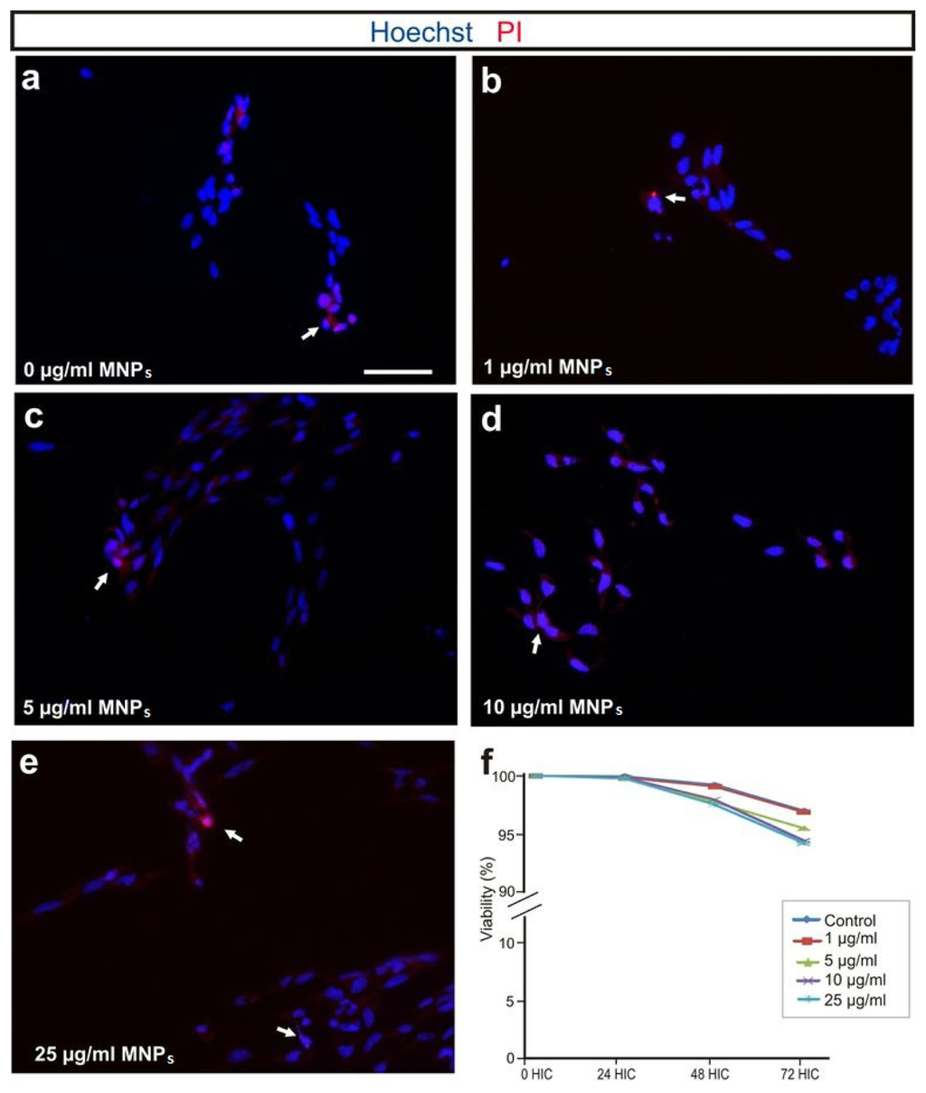 (a–e) Fluorescent microscopy of cells treated with MNPs 0, 1, 5, 10 and 25 μg/mL, respectively. Blue: Hoechst nuclear staining. Red: PI staining (white arrows show PI positive cells); (f) PI staining via flow cytometry of cells treated for 72 h with MNPs (1–25 μg/mL) (p > 0.05, ANOVA).