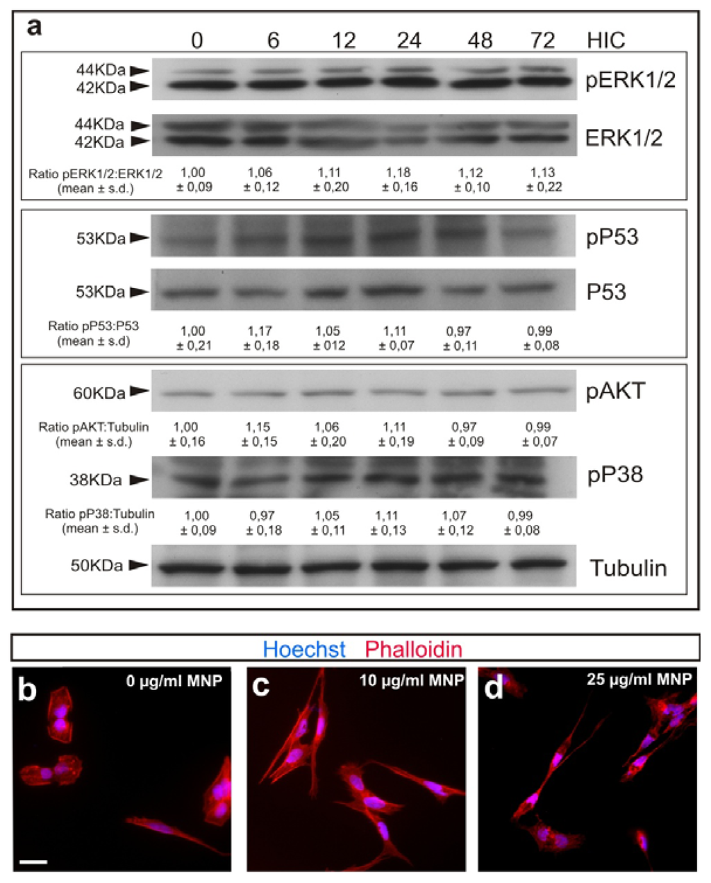 (a) Western blot analysis for M-OECs treated with MNPs (10 μg/mL) for 0, 6, 12, 24, 48 and 72 h in culture (HIC). Notice that activation levels of pERK1/2, pAKT, pP38 and pP53 are unchanged after MNP treatment. p > 0.1, ANOVA. (b–d) Phalloidin (red) and Hoechst (blue) staining for cells treated with 0, 10 and 25 μg/mL of MNPs for 24 h (b,c and d, respectively).