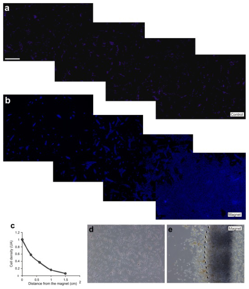 (a) Hoechst staining of M-OECs treated with MNPs (10 μg/mL); (b) Hoechst staining of M-OECs treated with MNPs (10 μg/mL); 8 h after the seeding, the magnet was placed inside the 3,5 mm ø petri dish for 12 h, when the images were acquired. (c) Quantification of cell density (y-axis) vs. distance from the magnet (x-axis) in the experiments. Note the increased number of M-OECs close to the magnet. (d,e) White field of a and b, respectively.
