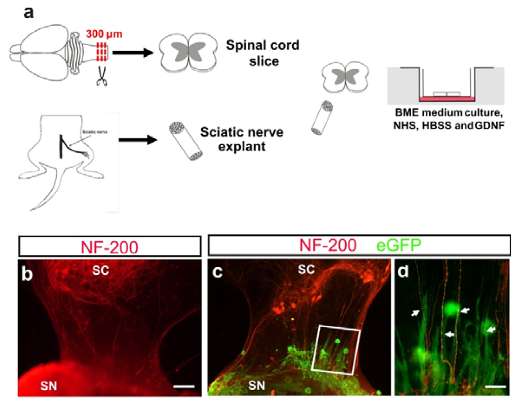 The olfactory ensheathing cell line used in 3D co-cultures experiments were obtained by lentiviral infection with eGFP-expressing lentivirus (see [] for details). The model used consists of spinal cord slices co-cultured with a sciatic nerve graft for ventral root reconstruction (Figure 5a) (see also [] for details).