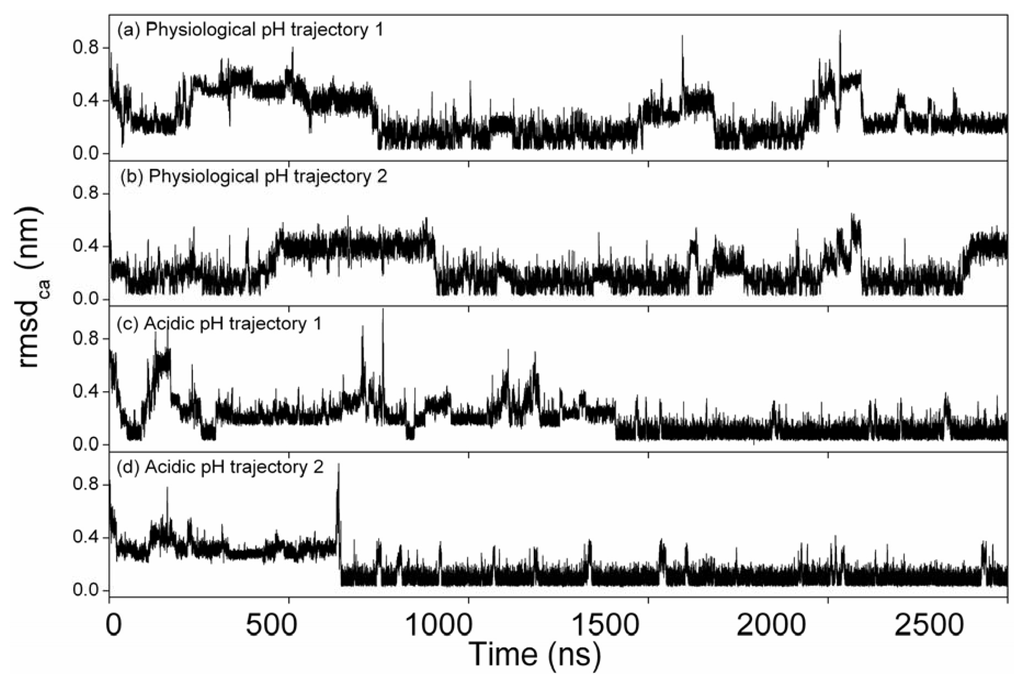 At each pH, two independent simulations with different initial velocities were performed. Each simulation trajectory was run for 2500 ns at the temperature T = 300 K and the pressure P = 1 bar. The temperature of the system was kept constant by using velocity rescaling with a stochastic term []. The pressure of the system was kept constant by using a weak coupling algorithm []. The simulation was made using a temperature coupling time of 0.1 ps and pressure coupling time of 0.5 ps, and an isothermal compressibility of 4.575 × 10−4 (kJ·mol−1·nm−3)−4. The time step for the MD integrator was set to 2 fs and LINCS [] was applied to constrain all bond lengths.