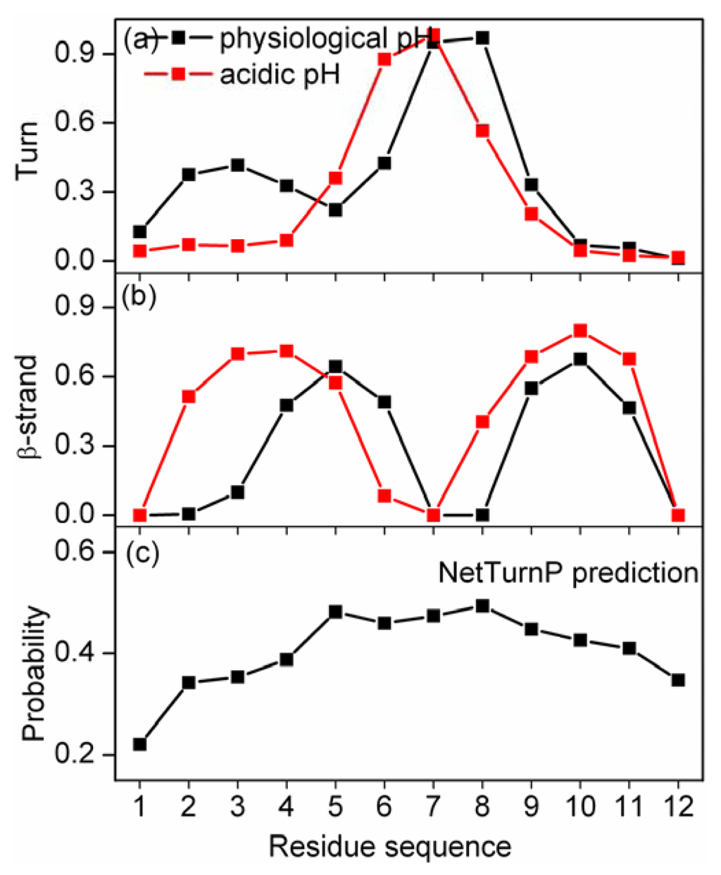 Residues such as Asn, Asp, Gly, Pro and Ser tend to form turns. In this sequence, the probabilities of each residue to form turns can be predicted with the software NetTurnP [] and the results are shown in Figure 3c. At physiological pH, Asp2 is negatively charged, which experiences electrostatic attraction from Lys6. However, at acidic pH, Asp2 is neutral. This makes it difficult to form Turn5-2 at acidic pH.