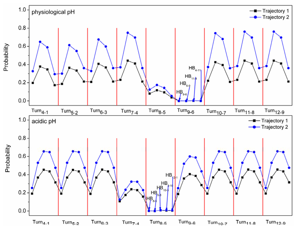 The β-hairpin configuration can be produced in the simulations for the α-syn12 peptide using the GROMOS 43A1 force field. Hydrogen bond and β-turn are two important factors involved in the folding for β-hairpin structure. The probabilities of forming turn and hydrogen bonds at different pH are shown in Table 1. Although the simulations at different pH produce different turns and hydrogen bonds, the probabilities of conformation forming four hydrogen bonds are lower than the probabilities of conformation forming turns. In order to analyze the interplay between the formation of the turns and hydrogen bonds, the probabilities of conformation forming hydrogen bonds when the turns do not form were analyzed in detail and shown in Figure 4. For simulations at physiological pH, as described in Figure 4, it is shown that when turn9-6 does not form, the probability of conformation forming hydrogen bonds is zero for all the simulations. The other turns do not indicate this probability. The results showed that turn9-6 always forms before the formation of hydrogen bonds. The simulations at acidic pH also suggested that turn8-5 always forms before the formation of hydrogen bonds. This occurred in all four trajectories and indicates that the formation of the turn drives the folding process