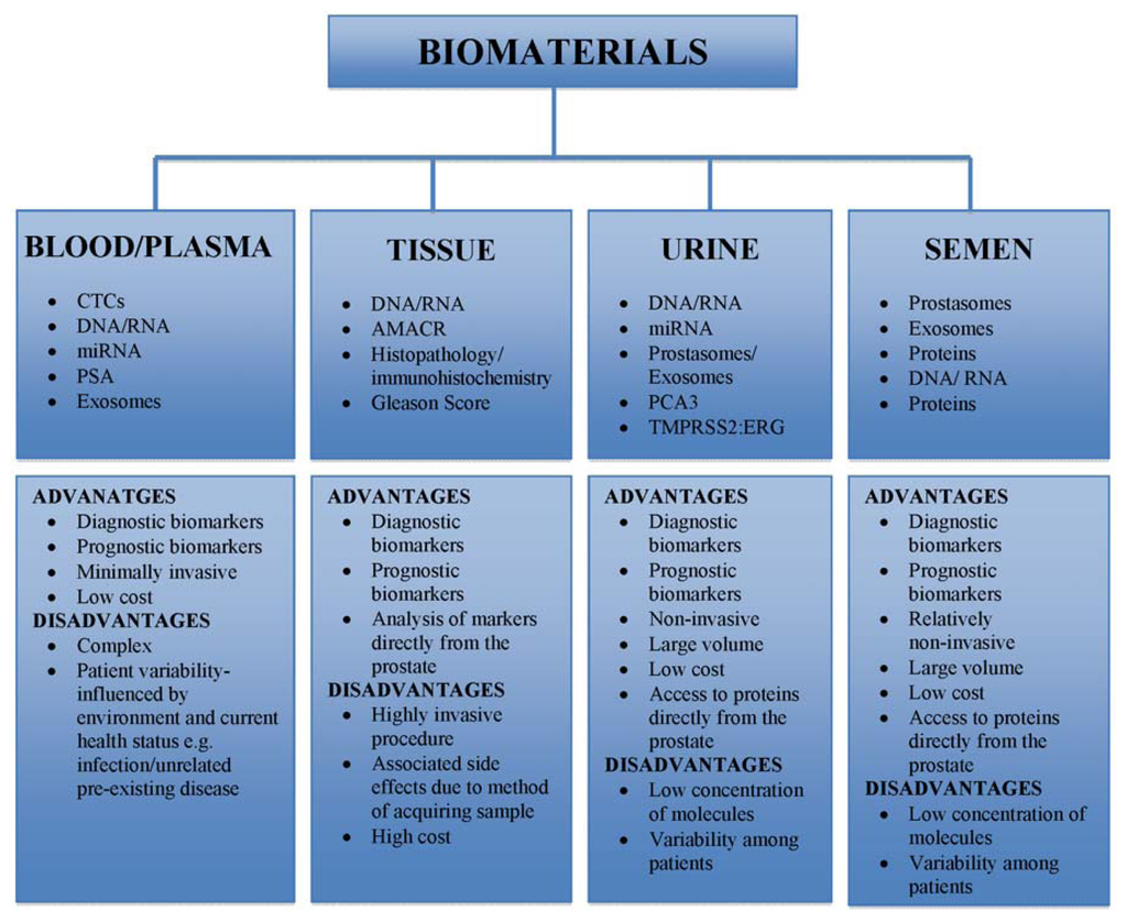 Figure 1. Biomaterials currently available for the identification of prostate cancer biomarkers. Common biological specimens for PCa research include blood, urine, semen and prostate tissue. Each biological sample has associated advantages and disadvantages that may affect clinical validation of biomarkers and adoption for routine testing. Human plasma contains the largest amount of human proteins that could serve as potential markers for PCa diagnosis and prognosis. Urine has become a popular source for proteomic biomarker discovery and analysis due to its non-invasive nature. It contains a vast array of markers that could distinguish between healthy BPH and malignant PCa. Semen is a relatively non-invasive material for analyzing prostate biomarkers. Proteins directly from the prostate are easily accessed; however, there is a compositional variability among patients that poses an issue. Finally, prostate tissue, although a rich source of potential PCa biomarkers, is the most invasive of sampling sites. Abbreviations: CTCs, circulating tumor cells; miRNA, micro RNA; AMACR; alpha-methylacyl-CoA racemase.