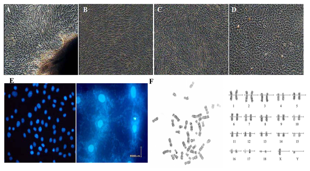 Morphology, Mycoplasma contamination and karyotype of Bengal tiger cell line. (A) Primary cells (×100), the cells were typical long spindle-shape; (B) Subcultured cells (×100); (C) Cells before cryopreservation (×100); (D) Cells after recovery (×100); (E) Mycoplasma contamination stained with Hoechst33258 and positive control of Mycoplasma contamination; (F) G-band chromosome at metaphase (Left) and karyotype (Right) (♂, ×1,000).