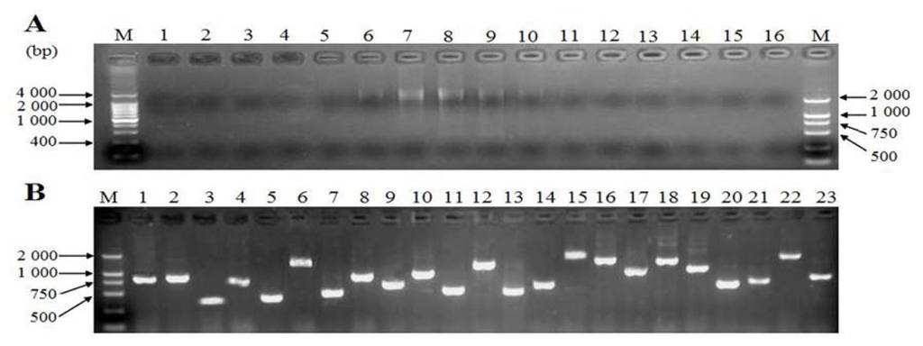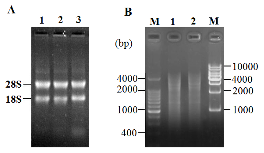 The ratio of OD260/OD280 for total RNAs was approximately 1.96–2.08 and the concentrations were 0.926–1.231 μg/μL. As shown in Figure 2A, two bright bands of 18S rRNA and 28S rRNA can be seen clearly, indicating that the total RNA was pure, integrated and stable enough for cDNA library construction. The stability of RNA was verified by incubating a small sample at 37 °C for two and three hours. There were little differences among the incubated and the fresh samples. Two micrograms of total RNA was subjected to reverse transcription for synthesis of the first and double-stranded cDNAs for LD-PCR. As shown in Figure 2B, the ds-DNA appeared as a smear of bands of 0.5–4 kb on the gel.