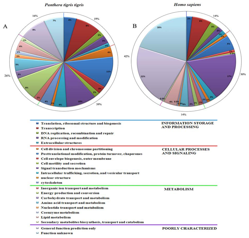 Comparison of classification of ESTs from P. t. tigris cDNA library based on their putative functions with those of H. sapiens. Two cDNA data sets were classified into functional groups by using the Clusters of Orthologous Group (COG) database.