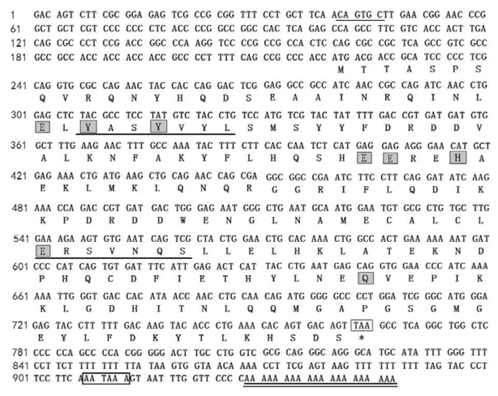 The primary cDNA library, instead of the amplified library, was used for generation of ESTs to reduce the redundancy of cDNA clones as only a small number of ESTs were targeted through random selection. Four hundred and fifty-six white clones were picked randomly for EST sequencing. After removal of the vector sequences and low-quality sequences, 354 effective sequences from the total cDNA sequences were obtained, a total of 212 individual ESTs ranging from 356 to 1108 nucleotides in length were analyzed and partly deposited in the GenBank under accession No. from JZ331652 to JZ331708.