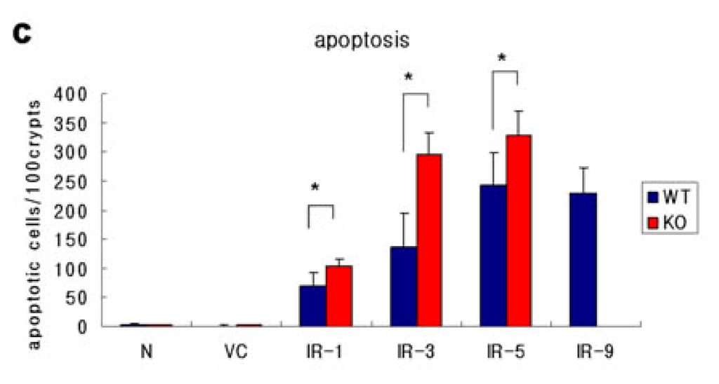 The aim of the present study was to determine the difference in spontaneous and irradiation-induced apoptosis between SMP30 KO and WT mice after abdomino-pelvic irradiation. Matsuyama et al. suggested that SMP30 plays a role as a survival factor by preventing apoptosis in the liver []. Since SMP30 KO mice cannot synthesize vitamin C due to the genetic disruption of gluconolactonase [], it was also evaluated how the absence of vitamin C can affect spontaneous apoptosis in SMP30 KO mice. In this study, there was no significant differences in the degree of crypt cell apoptosis between vitatmin C treated SMP30 KO mice (VC group) and vitamin C depleted SMP30 KO mice (N group). The present study also showed no significant change in spontaneous apoptosis between non-irradiated SMP30 WT (WT N group) and KO (KO N group) mice. However, after irradiation, dramatically increased apoptosis in the SMP30 KO mice, compared to WT mice, was observed in each group irradiated with 1, 3, and 5 Gy. Moreover, all SMP30 KO mice irradiated with 9 Gy died suddenly before originally scheduled sacrifice time due to an excessive irradiation. Since this excessively high dose of irradiation can induce a cellular necrosis, which was unintended, the samples were excluded in the present study.