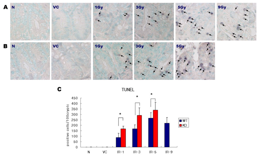 Following irradiation, typical morphological appearance of apoptosis in the crypts of the mouse small intestines was observed in both irradiated SMP30 WT and KO mice with hematoxylin and eosin (H&E) staining (Figure 1). As shown in Figure 1, there was no histological difference between 0 Gy N groups and VC groups of both WT and SMP30 KO mice showing only a normal structure and morphology of crypts. In WT mice, apoptotic cells (arrows) increased dose-dependently according to the increase in irradiation dose from 0 to 1, 3, and 5 Gy. In the 9 Gy group, no difference was observed compared to the 5 Gy group. Apoptosis of SMP30 KO mice (arrow) also increased dose-dependently according to the increase in irradiation dose from 0 to 1, 3, and 5 Gy. Radiation-induced crypt apoptosis was more significantly increased in the SMP30 KO mice compared with the WT mice at each dose of irradiation. Moreover, apoptosis in the crypt enterocytes was also observed by terminal deoxynucleotide transferase labelling of DNA strand breaks (TUNEL) assay (Figure 2), which positively detected cells containing DNA fragments (arrows). In the SMP30-WT mice, the number of apoptotic cells in the crypts rose with increasing radiation doses from 0 to 1, 3, and 5 Gy and with no further increases at 9 Gy of irradiation (Figure 1A,C). Radiation-induced apoptosis in SMP30-KO mice also increased in the same manner; however, it was much more dramatic compared to that of the SMP30-WT mice, especially at 3 Gy of irradiation. At 3 Gy of irradiation, the radiation-induced apoptosis of the small intestines in the SMP30-KO mice was more than 3 times than that of 1 Gy of irradiation in the SMP30-KO mice. When compared to 3 Gy of irradiation, there was no significant difference in the apoptotic index at 5 Gy of irradiation in the SMP30-KO mice (Figure 1B,C). As shown in Figure 2, the apoptotic index has a similar pattern shown by TUNEL staining.