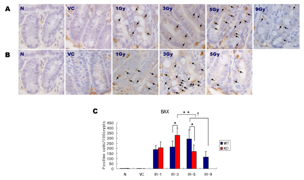 (A) BAX expression detected by immunohistochemistry in the crypts of the intestine in the WT mice: N, normal control; VC, vitamin C; Gy, Gray. Original magnification × 1000, Bars = 20 μm. (B) BAX expression detected by immunohistochemistry in the crypts of the intestine in SMP30 KO mice. N, normal control; VC, vitamin C; Gy, Gray. Original magnification 1000×, Bars = 20 μm. (C) Positive cells were quantified from immunohistochemically stained sections with BAX. Values represent the mean ± SD in each group. WT; wild type, KO; knock out. *, **, and †, Statistically significant difference (p < 0.05).