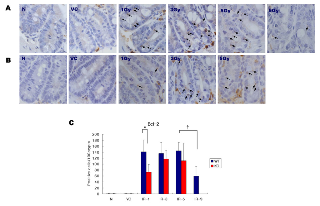 Bcl-2 expression detected by immunohistochemistry in the crypts of the intestine in WT mice (A) and SMP30 KO mice (B). N, normal control; VC, vitamin C; Gy, Gray. Original magnification × 1000, Bars = 20 μm. (C) Positive cells were quantified from the immunohistochemically stained sections with Bcl2. Values represent the mean ± SD in each group. WT, wild type; KO, knock out; * and †, Statistically significant difference (p < 0.05).