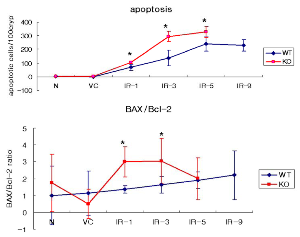 The expression of BAX in the crypts was significantly increased after irradiation in both the SMP30-KO and WT mice. The increase of BAX expression in the SMP30 WT mice was dose-dependent when increasing the radiation dose from 0 to 1, 3, and 5 Gy. However, we found a significant decrease in BAX expression of the 9 Gy group compared that of 5 Gy group (p < 0.05). Morever, the BAX expression of the 9 Gy group also showed the lowest values among other radiation dose groups in the SMP30 WT mice. In SMP30 KO mice, the BAX expression showed an increasing trend in each 1 Gy and 3 Gy groups compared to those of the SMP30-WT mice; however, significant difference in BAX expression was observed only in the 3 Gy group. Interestingly, in the 5 Gy SMP30-KO group, there was a significant decrease in BAX expression when compared to the 5 Gy SMP30-WT group.