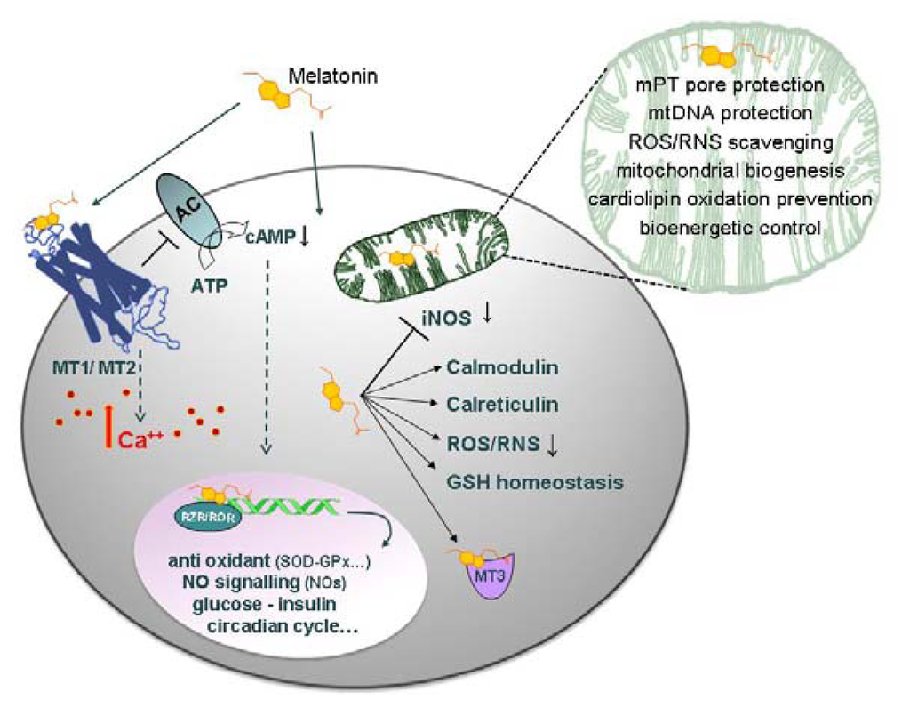 Melatonin on the cell stage. Melatonin interacts with cells in a receptor-dependent or -independent manner. The receptors on the cell membrane, MT1 (Mel 1a) and MT2 (Mel 1b), consist of seven transmembrane helices, G protein-coupled. Activating G protein signaling, the receptors mediate a wide variety of effects; among others, inhibition of the adenylate cyclase (AC), with a consequent cyclic AMP (cAMP) decrease, regulation of gene transcription, activation of protein kinase C subtypes and changes of intracellular Ca++ levels. Independently of receptors, melatonin permeates cell membranes and, owing to its low redox potential, Eo = −980 mV [21], scavenges the ROS in the cell cytoplasm, mitochondria and nucleus. In the cytoplasm, melatonin maintains GSH homeostasis and interacts with proteins, such as calmodulin (CaCaM), calreticulin and the cytosolic quinone reductase 2 enzyme, (MT3). Melatonin is also a ligand for a nuclear retinoid related orphan nuclear hormone receptor (RZR/RORa) regulating the expression of anti-oxidant enzymes, such as glutathione peroxidase (GPx), glutathione reductase (GRd) and superoxide dismutase (SOD), and downregulating pro-oxidant enzymes, such as the NOSs, particularly the iNOS [35]. Melatonin is accumulated in mitochondria at high concentrations, where it scavenges ROS and RNS. Melatonin also protects cardiolipin from oxidation [36] and prevents respiratory chain complexes, as well as mtDNA from free radical attack, thus ultimately protecting the membrane permeability transition (mPT) pore, thus preventing cell apoptosis.