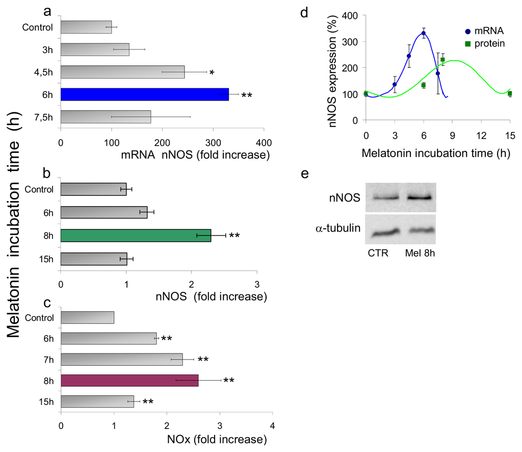 Time-dependent effects of nM melatonin on nNOS expression and NOx production. HaCaT cells were incubated with 1 nM melatonin; at the times indicated, the nNOS mRNA (a), nNOS protein (b) and nitrite/nitrate (NOx) production (c) were assayed. (a) QRT-PCR analysis of mRNA expression was performed in the presence of specific primers for nNOS. The relative expression levels were calculated vs. untreated controls (ß-actin normalized). The maximal mRNA expression at 6 h (blue). Data +/− SEM, n ≥ 3. **p ≤ 0.01 vs. control; *p ≤ 0.05 vs. control; (b) Western blot analysis of nNOS protein. Data shown as fold increase vs. the nNOS protein expressed by control cells, as a function of incubation time. The maximal protein synthesis at 8 h (green). Data +/− SEM, n ≥ 3. **p ≤ 0.01 vs. control; (c) NOx accumulation measured in the supernatant as a function of time. Data shown as fold increase vs. control (untreated). The maximal NOx production at 8 h (violet). Data +/− SEM, n ≥ 5. **p ≤ 0.01 vs. control; (d) Time-dependent profile of the expression of the nNOS mRNA (blue) and nNOS protein (green); (e) Western Blot of cells incubated 8 h with 1 nM melatonin and controls (CTR); α-tubulin as reference.