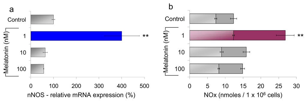 Concentration dependence effect of melatonin (nanomolar) on nNOS expression and NOx production. HaCaT cells were treated with increasing melatonin concentrations (1, 10, 100 nM). (a) After 6 h of melatonin incubation, the RNA extracted (10 ng) was retro-transcribed and subjected to QRT-PCR in the presence of specific primers for nNOS. The relative expression levels were calculated vs. control after normalization for ß-actin. Data +/− SEM, n = 3. **p ≤ 0.01 vs. control; (b) NOx accumulation in the supernatant of HaCaT cells was quantified after 6 h (light bars) and 8 h (heavy bars) incubation with increasing melatonin concentrations. Data are expressed as means +/− SEM, n ≥ 5. **p ≤ 0.01 vs. control.