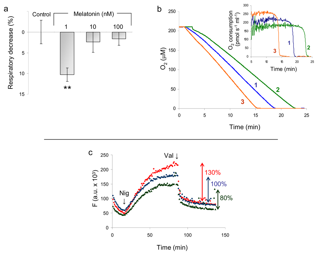 A bioenergetic involvement of melatonin is supported by the effects induced on the respiratory chain, though their interpretation is not always straightforward [16]. Difficulties in comparing data are partly linked to differences in the experimental set up. Experiments have been carried out, in fact, with fully integrated systems, such as animals or cells in culture, but also using isolated mitochondria. In the latter case, regardless of whether the organelles are functionally intact or not, the nuclear signaling-dependent reactions do not occur. In addition, it should be kept in mind that the intracellular concentration of melatonin putatively reached under the given conditions, unless directly measured, remains uncertain owing to the ability of different cell organelles, e.g., mitochondria [37], and compartments, e.g., nuclei [38], to accumulate melatonin to a different extent.