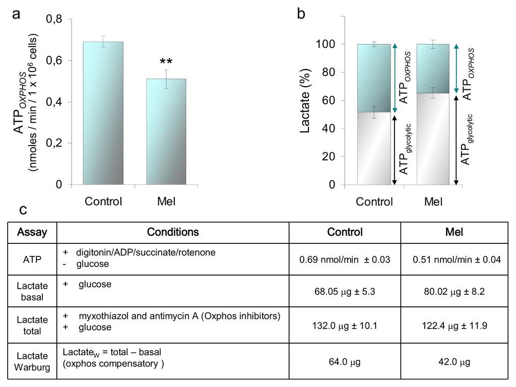 Effect of melatonin on the production of ATPOXPHOS and lactate. ATP and lactate were assayed in HaCaT cells incubated 6h with melatonin, 1 nM. (a) Rate of ATP synthesis: Complex II driven ATP synthesis was measured using cells permeabilized with 60 μg/mL digitonin in the presence of 20 mM succinate, 4 μM rotenone and 0.5 mM ADP. ATP measurements carried out according to the luciferin/luciferase assay [41]. Data +/− SEM, n ≥ 14. **p ≤ 0.01 vs. control; (b) Lactate production by HaCaT cells incubated 3 h with glucose, 1 mM, and in the presence and absence of myxothiazol and antimycin A, 10 μM each. Basal lactate (gray bar) is produced by the cells in the absence of inhibitors and has been taken as ≈ ATPglycolytic. The lactate produced in the presence of inhibitors has been taken as the maximal lactate (total, 100%). The difference between total and basal lactate is the Warburg lactate (cyan); Warburg lactate ≈ ATPOXPHOS. Values are the means +/− SEM; n = 4. *p ≤ 0.05 vs. control; (c) Synoptic table of the ATP and lactate amounts measured under the conditions described in (a) and (b).
