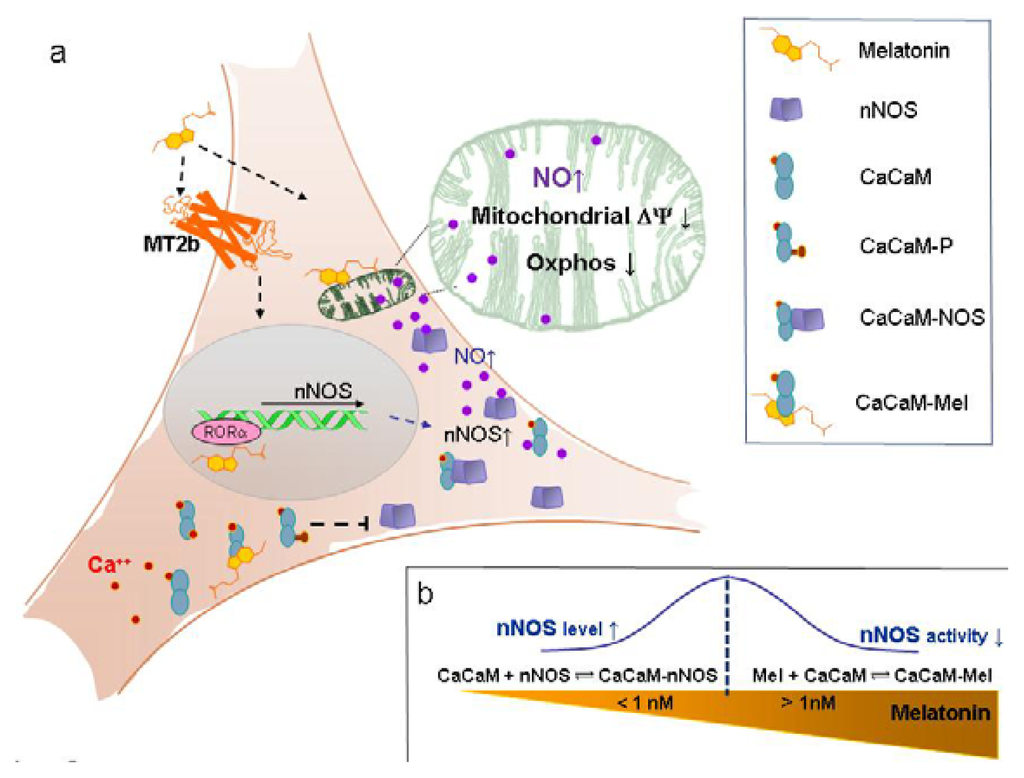 In this frame, when the extracellular hormone concentration is low (nanomolar or less), the nuclear mediated nNOS activation occurs, also sustained by the cell availability of calmodulin (high affinity nNOS cofactor [73]). As the incubation time increases, the intracellular concentration of melatonin (and/or its metabolites) increases, too (Figure 6b). At this stage, due to the high affinity of melatonin for calmodulin [74] a competition between melatonin and nNOS for calmodulin occurs, inducing progressive nNOS inhibition [58] (Figure 6).