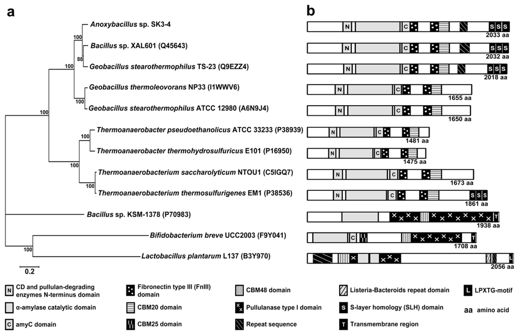 - Matuschek, M.; Burchhardt, G.; Sahm, K.; Bahl, H. Pullulanase of Thermoanaerobacterium thermosulfurigenes EM1 (Clostridium thermosulfurogenes): Molecular analysis of the gene, composite structure of the enzyme, and a common model for its attachment to the cell surface. J. Bacteriol 1994, 176, 3295–3302. [Google Scholar]