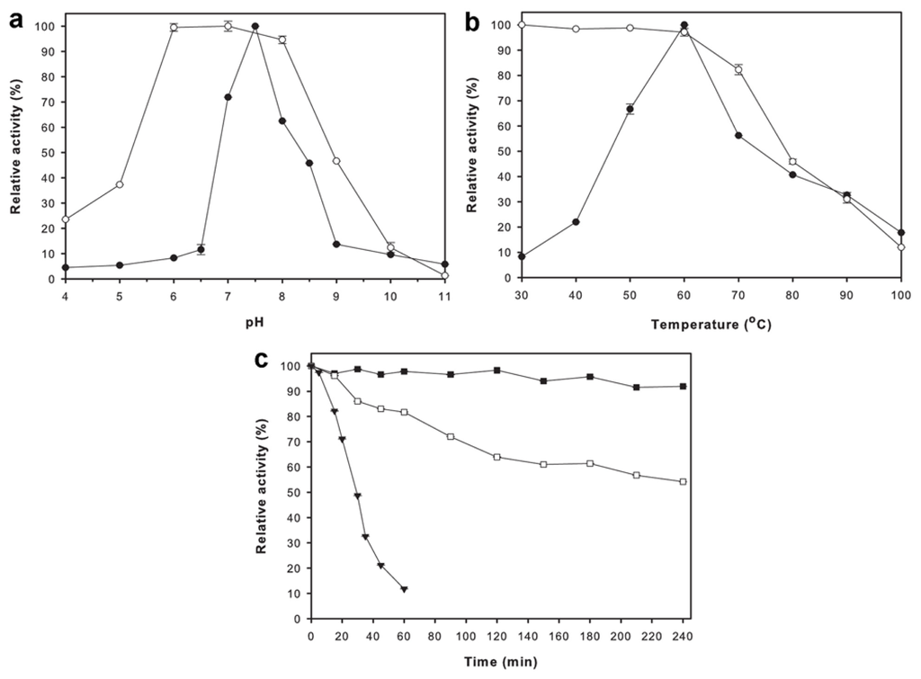 2.4. Effects of pH and Temperature on Enzyme Activity and Stability