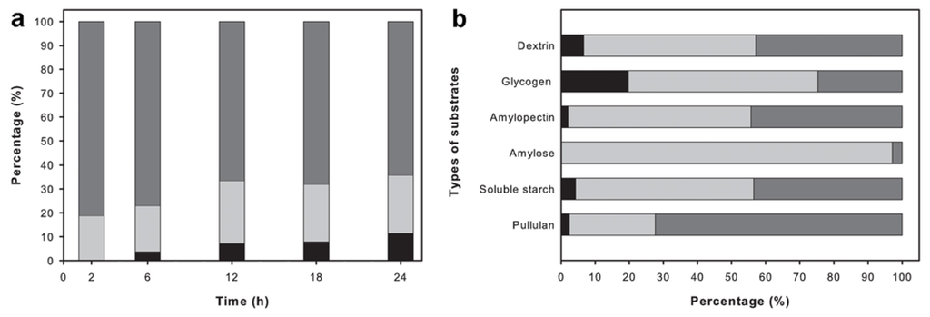- Lin, F.-P.; Ma, H.-Y.; Lin, H.-J.; Liu, S.-M.; Tzou, W.-S. Biochemical characterization of two truncated forms of amylopullulanase from Thermoanaerobacterium saccharolyticum NTOU1 to identify its enzymatically active region. Appl. Biochem. Biotechnol 2011, 165, 1047–1056. [Google Scholar]