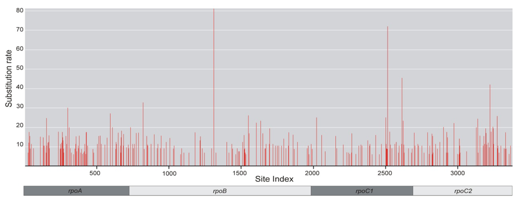 The rpoA and rpoC2 genes are in this respect much less diverse, which makes their phylogenetic signal more reliable. From the viewpoint of molecular taxonomy, a uniform rate of substitution is preferred within a given segment of the genome [17,18]. The presence of highly variable sites increases the likelihood of reverse mutations or homoplasy, which in turn makes it difficult to correctly reconstruct the phylogenetic relationships [7]. Our observations support findings of investigations carried out at higher taxonomic levels, i.e., in division Magnoliophyta, in which the rpoA and rpoC2 are better phylogenetic markers than rpoB and rpoC1 [7]. The result obtained by Logacheva et al. [7] based on the number of correctly resolved nodes of phylogenetic tree, which was adopted as a measure of effectiveness.