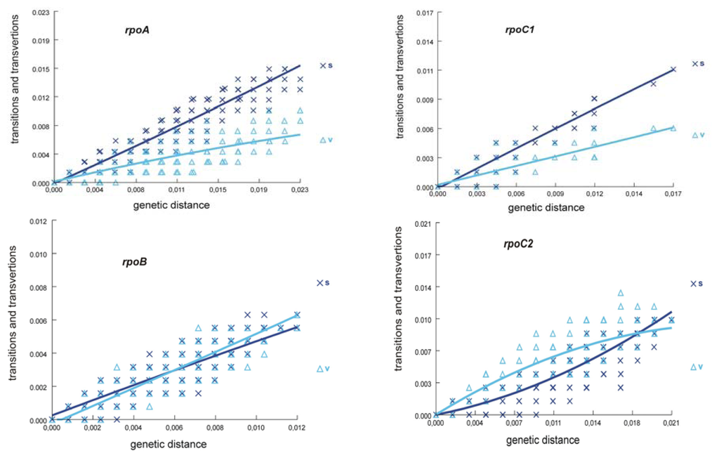 Individual genome fragments can provide a reliable phylogenetic signal on condition that they have not yet reached the state of substitution saturation. Otherwise, it is difficult to ascertain whether the similarity observed in the pair of sequences is an inherited trait from a common ancestor, or a homoplasy [14,19]. The level of substitution saturation in rpo genes was measured by comparing the number of transitions and transversions with the size of the genetic distance for each pair of sequences (Figure 3). The analysis of these genes showed that the amount of substitutions was increasing with the extension of genetic distance. Only the number of transversions within the rpoC2 gene showed a lower increasing tendency. However, none of the four plots took the form of a plateau, which is typical of the state of saturation with substitutions. Hence, the result achieved speaks for the usefulness of the rpo genes in phylogenetic inference in the genus Lamium.
