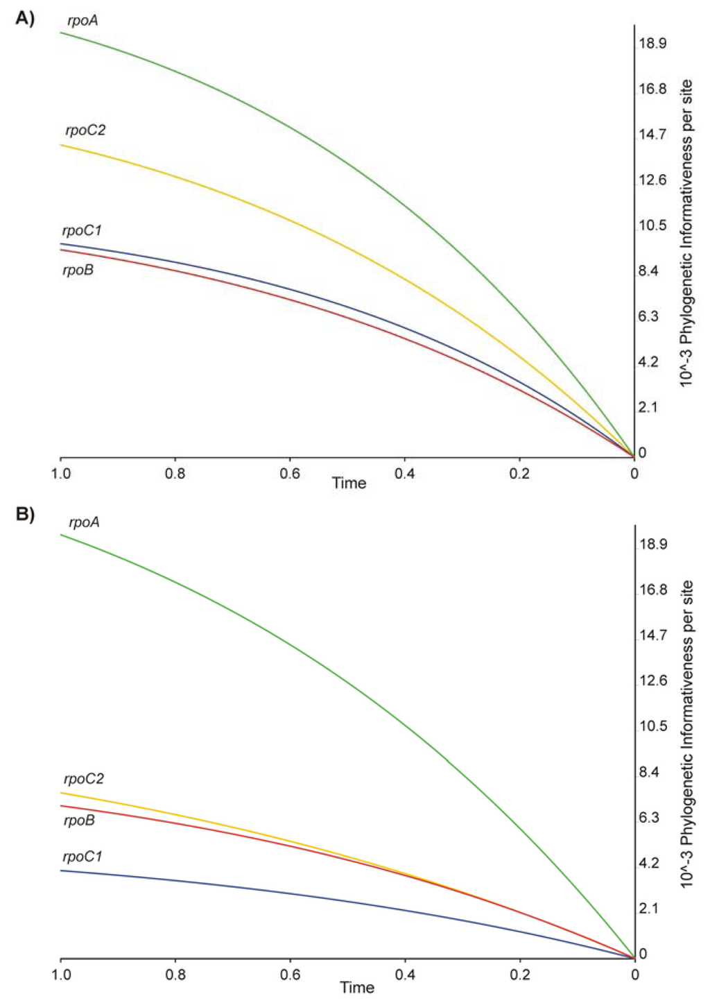 Profile of phylogenetic informativeness for rpo genes per site calculated from (A) the nucleotide and (B) the amino acids sequences (rpoA—green, rpoB—red, rpoC1—blue, rpoC2—yellow). The time axis is calibrated in relation to the ultrametrisized ML tree derived from the dataset of four rpo genes. An evolutionary time of 1.0 corresponds to the root of the tree and the value of 0 to its tips.