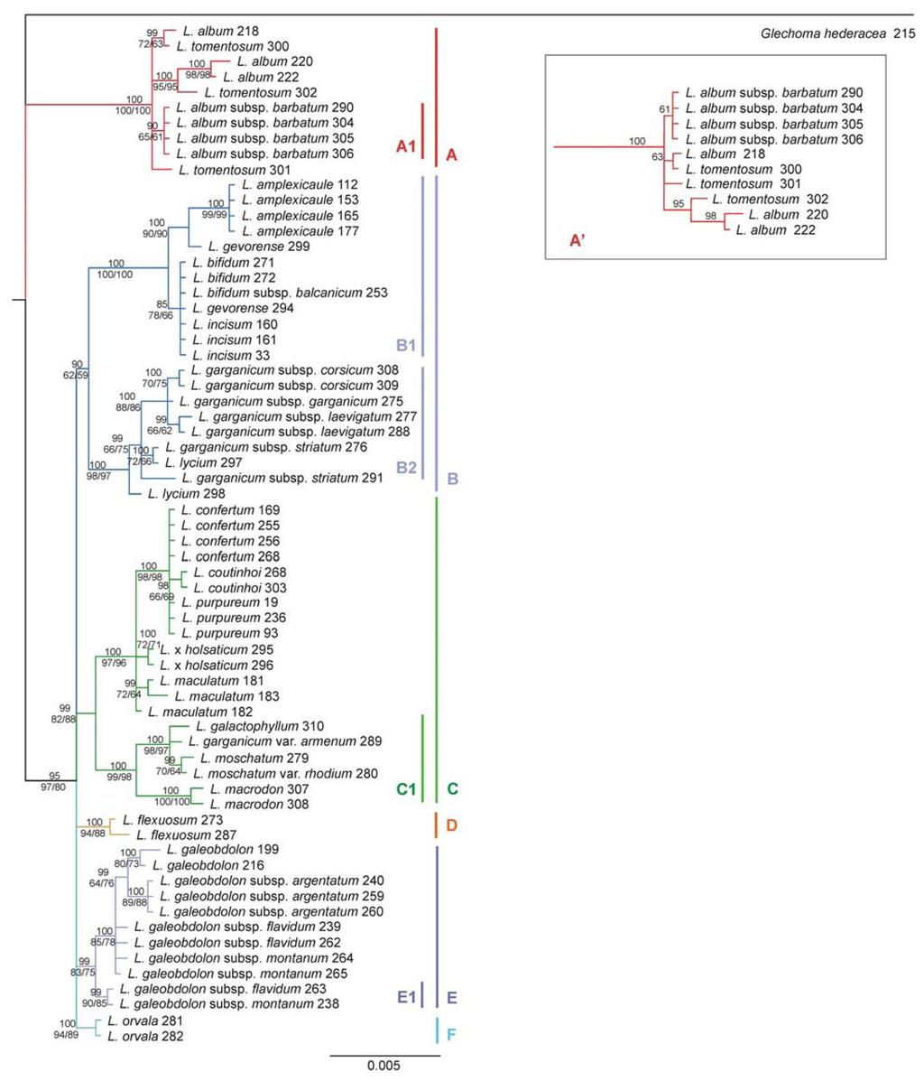 Worthy of special attention in this study was a clear distinction of L. garganicum var. armenum from other representatives of L. garganicum, indicated by a separate, highly supported clade (B2) formed by L. garganicum on the phylogram. It was additionally distinguished by three adaptive mutations, which did not appear in other phylogenetic lines (Table 2). The subspecies L. garganicum var. armenum was located in the clade C, also very reliable statistically. Due to such large differences between these taxa, it was reasonable to exclude L. garganicum var. armenum from the species L. garganicum and adopt its correct synonymous name L. armenum Boiss. To our knowledge, the discussed taxon has never been addressed in molecular studies.