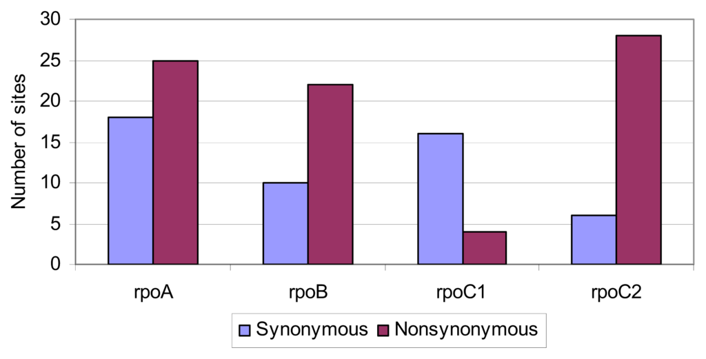 The genes we tested differed in the content of silent mutations and missense mutations. Predominance of variable sites containing synonymous substitutions was reported only for the rpoC1 gene (Figure 6). Other genes had more non-synonymous sites. Their largest number and the largest percentage in relation to all variable sites was found in the rpoC2 gene, where out of 34 variable sites, 28 had non-synonymous substitutions.