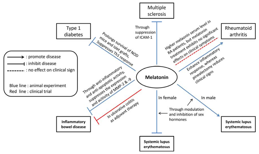 Another concern in the application of melatonin treatment for autoimmune diseases is the high doses used in the experiments with animal models. However, melatonin exhibits a high level of safety in clinical trials. In a clinical trial in patients with amyotrophic lateral sclerosis, a daily oral dose of 30–60 mg of melatonin was well tolerated and generated no side effects []. In a later clinical trial, patients who received daily rectal melatonin treatment at a higher dose (300 mg per day) also did not show any complications []. A recent report also demonstrated that treatment of patients undergoing major aortic surgery with up to 60 mg intravenous melatonin during surgery was safe and without complications []. Therefore, application of a high pharmacological dose of melatonin in the therapy of autoimmune diseases should be acceptable. However, the treatment doses used in some of the animal studies are higher than the treatment of melatonin used in human clinical trials. Thus, the appropriate doses used in clinical application for inflammatory autoimmune diseases still need to be examined.