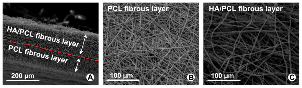 SEM observation for cross-sectional and surface morphological features of Polycaprolactone (PCL) fibers and hyaluronan (HA)/PCL fibers. (A) Cross-sectional of bi-layer electrospun fibrous membrane; (B) PCL electrospun fibers of outer layer; (C) HA/PCL electrospun fibers of inner layer.