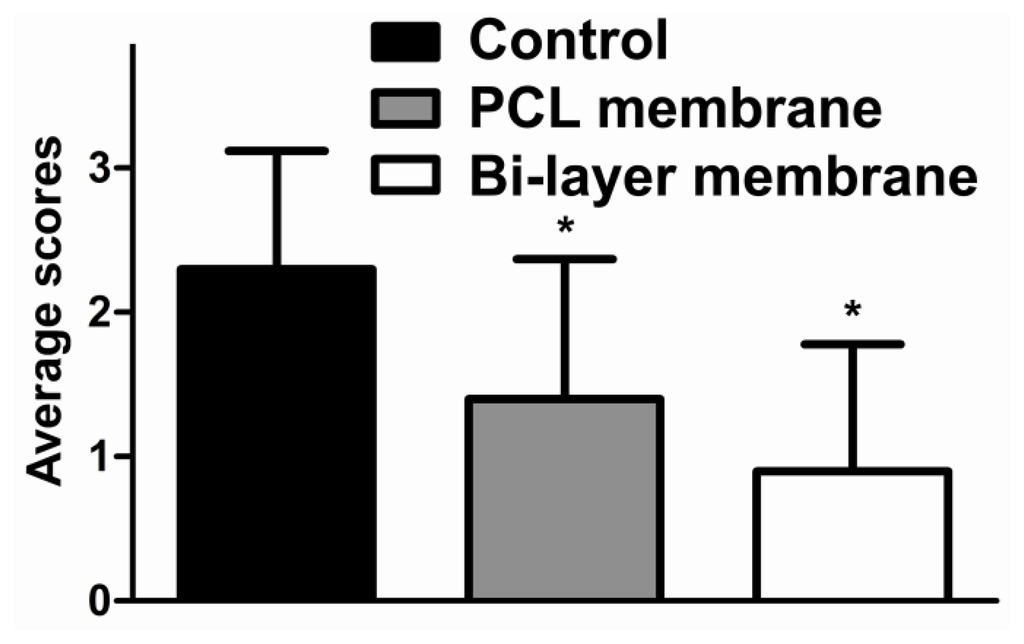 The average scores of intra-abdominal adhesion in the control group, bi-layer membrane group and PCL electrospun fibrous membranes group are presented as mean ± SD (n = 8).(* p < 0.05 vs. Control).