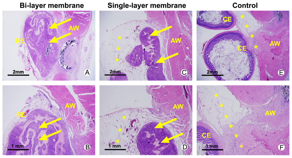 Hematoxylin and eosin (HE) staining of abdominal wall defects from bi-layer membrane treated (A,B), single-layer membrane treated (C,D) and untreated animals with severe adhesion (*) between the abdominal wall (AW) and the cecum (CE) surface. Remnants of the materials are highlighted with yellow arrows and located inside the re-epithelialized (RE) abdominal wall defect site.