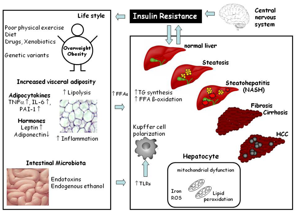 Schematic drawing of the molecular mechanisms involved in the development and progression of non-alcoholic fatty liver disease (NAFLD). The risk factors such as being overweight, visceral adiposity, adipocytokines may increase the flow of free fatty acids (FFAs) to the liver. Alterations of intestinal microbiota and increased permeation of bacterial endotoxins, from the gut may activate Toll-like receptor signaling cascades and lead to a M1 polarization of macrophages (e.g., of Kupffer cells and infiltrating macrophages). All these events (e.g., increased FFAs, adipocytokines, endotoxins, insulin resistance, macrophage polarization) may lead to the development of NAFLD. (Modified from Krawczyk et al. []).