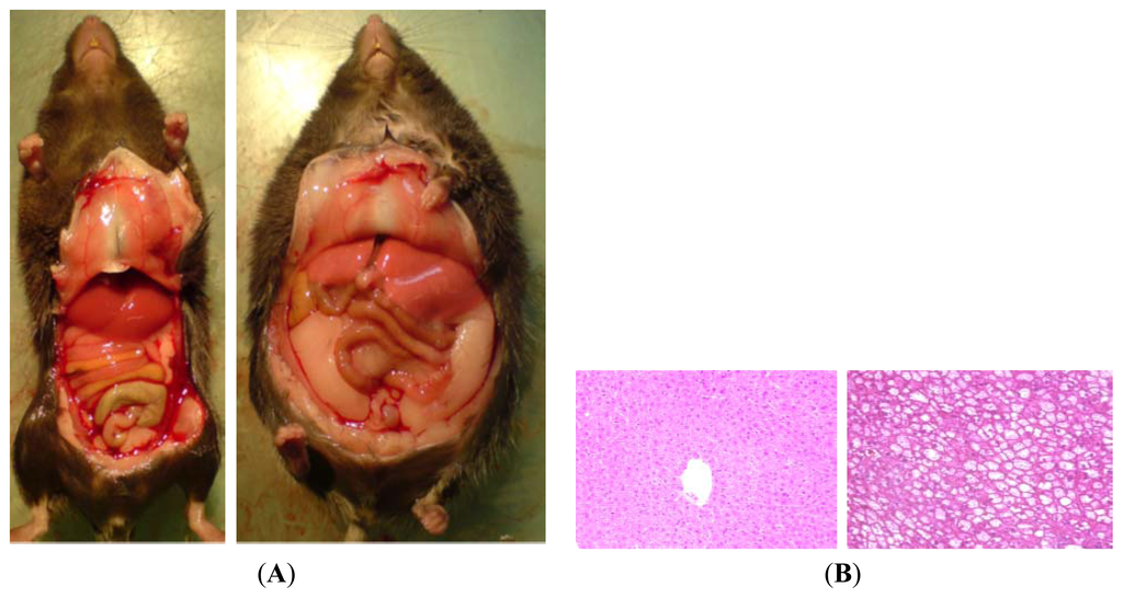Dietary models to induce NAFLD have relevance to human disease since alterations of dietary pattern and over-nutrition both are being associated with the development of overweight and insulin resistance have been identified to be key risk factors for the development of the disease. However, conversely to what is found in most patients with NAFLD, one of the most frequently used dietary models for NASH, the MCD diet, is a nutrient-deficient dietary model. The MCD diet normally contains substantial amounts of sucrose (e.g., 40%) and low amounts of fat [10%] but is deficient in methionine and choline, both being essential factors in human and animal nutrition. Rodents fed a MCD diet rapidly (e.g., within 1 to 2 weeks) develop hepatic steatosis due to enhanced uptake of fatty acids and decreased secretion of very-low-density lipoproteins from the liver (for overview see []). After two weeks, the development of steatosis is followed by necrosis and inflammation and then even progresses to pericellular and pericentral fibrosis. In addition, oxidative stress [], activation of Toll-like receptor (TLR) 4-dependent signalling cascades in the liver [] and changes in cytokines as well as adipocytokines occur [], all contributing to liver injury in this dietary model. Despite the fact that under the MCD diet rodents develop significantly faster and more pronounced liver damage, this dietary feeding regiment has some marked limitations. For instance, the main risk factors for the development of NAFLD found in humans (e.g., insulin resistance and overweight) are lacking; rather, severe weight loss of up to 35% over a period of 4 weeks has been reported []. Furthermore, it has been shown in several studies that the responsiveness of different mouse strains towards the MCD diet induced NAFLD varies considerably. Indeed, release of transaminases in different mouse strains can be ranked as follows: A/J > C57BL/6 > C3H/HeN = Balb/c = DBA/2J, whereas long term feeding of an only methionine deficient diet causes a more pronounced liver injury and even hepatocarcinogenesis in DBA/2J than in C57BL/6 mice [–].