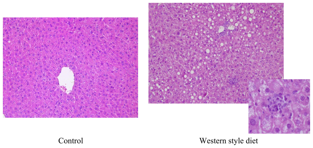Effect of feeding a Western-style diet on the liver. Representative photomicrographs of hematoxylin and eosin staining of liver sections (200×) of mice fed with control or Western-style diet for 6 weeks.