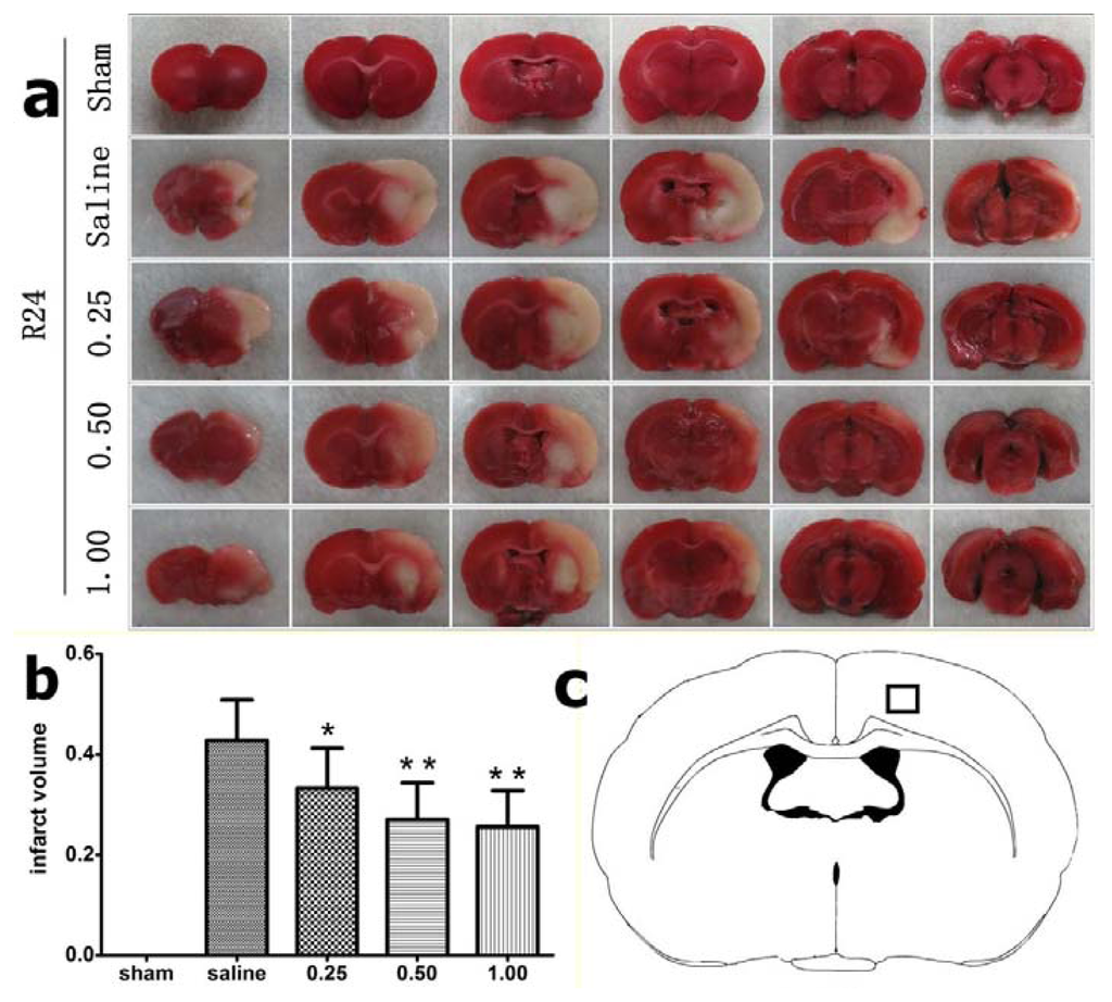 Rats were completely randomized into groups. A total rats of 39 were subjected to MCAO surgery and 3 rats were excluded due to the lack of contralateral paralysis. Immediately after reperfusion, 36 rats (n = 9 per group) were randomly treated with intraperitoneal doses of bpV[HOpic] (ENZO Life Sciences, Farmingdale, NY, USA) at 0.25, 0.5 or 1.0 mg/kg or with 0.9% saline vehicle. The drug was dissolved in vehicle immediately before injection to a total volume of 1 mL. All animals were sacrificed for TTC staining 24 h after reperfusion.