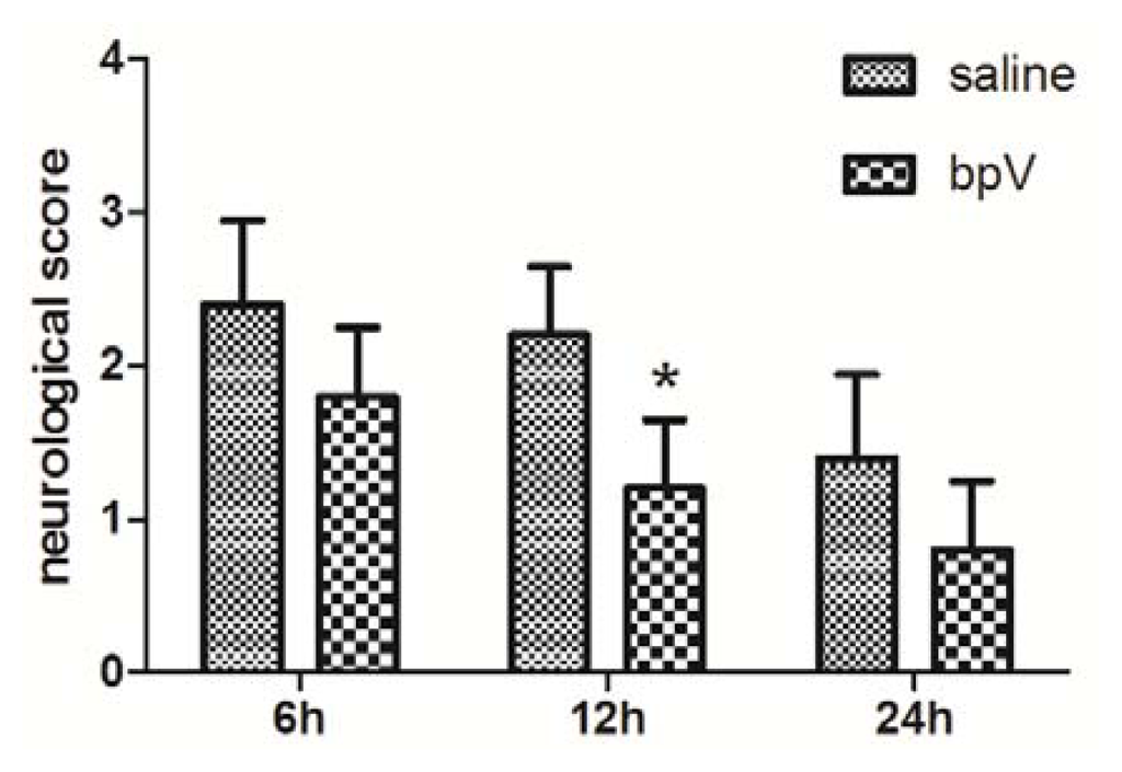 Neurological deficits were assessed 6, 12, and 24 h after reperfusion (evaluation system presented in Section 3.4). The groups treated with bpV exhibited remarkably reduced neurological deficit scores compared with the saline-treated group at 12 h after reperfusion (Figure 2, p < 0.05). However, at 6 and 24 h after reperfusion, no significant difference between the groups was found (Figure 2, p > 0.05).