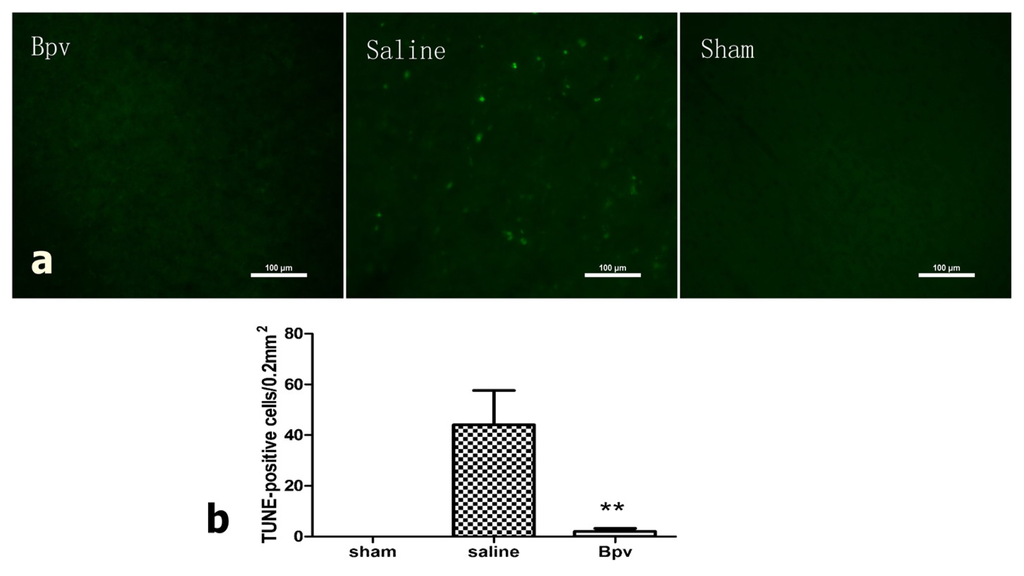 Bisperoxovanadium (bpV) administration blocks TUNEL-positive staining in the penumbral cortex 24 h after ischemia/reperfusion injury. (a) Photomicrographs of TUNEL-positive cells in the penumbral cortex. Scale bar = 100 μm; (b) Bar graphs of TUNEL-positive cell counts in each group. n = 5, ** p = 0.001.