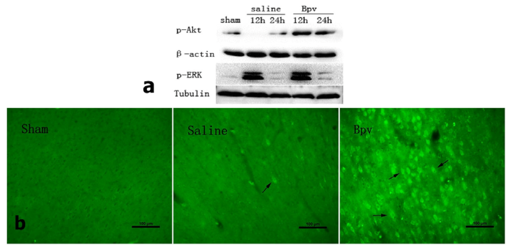 (a) Representative Western blots for p-Akt (Ser 473) and p-ERK1/2 with β-actin and tubulin serving as a loading control. n = 5; (b) Photomicrographs of p-Akt (Ser473) in the penumbral cortex in sham, saline-treated, and bpV-treated animals. The arrow indicates p-Akt (Ser473)-positive cells. Scale bar = 100 μm, n = 3.